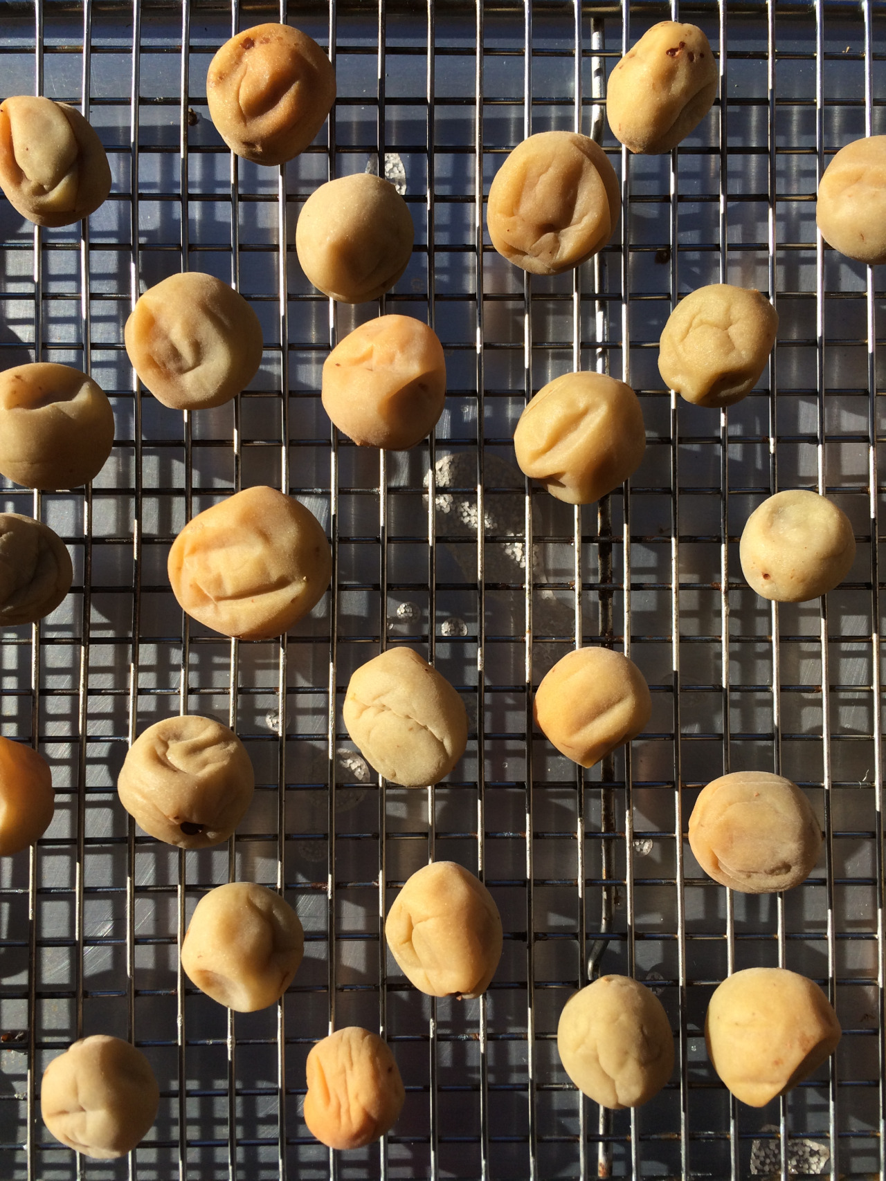First shot at umeboshi, aka fermented Japanese sour plum. Cured for about 6 weeks, 18% salt, then left to dry in the sun for two days. Nice matte finish on these puppies.
